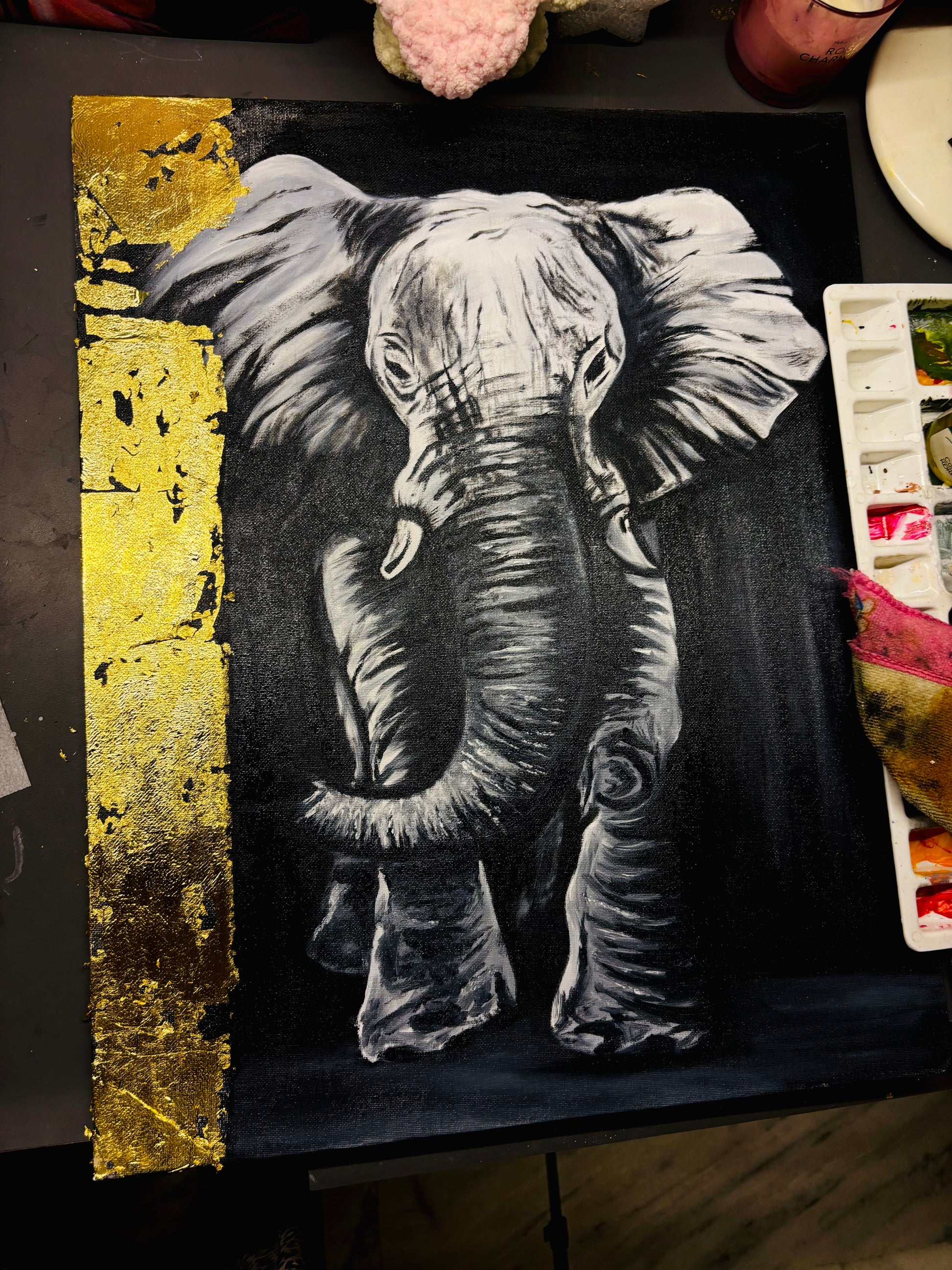 The textured brushwork and strong contrast between light and dark help the elephant stand out as the central focus, making the piece both powerful and elegant.