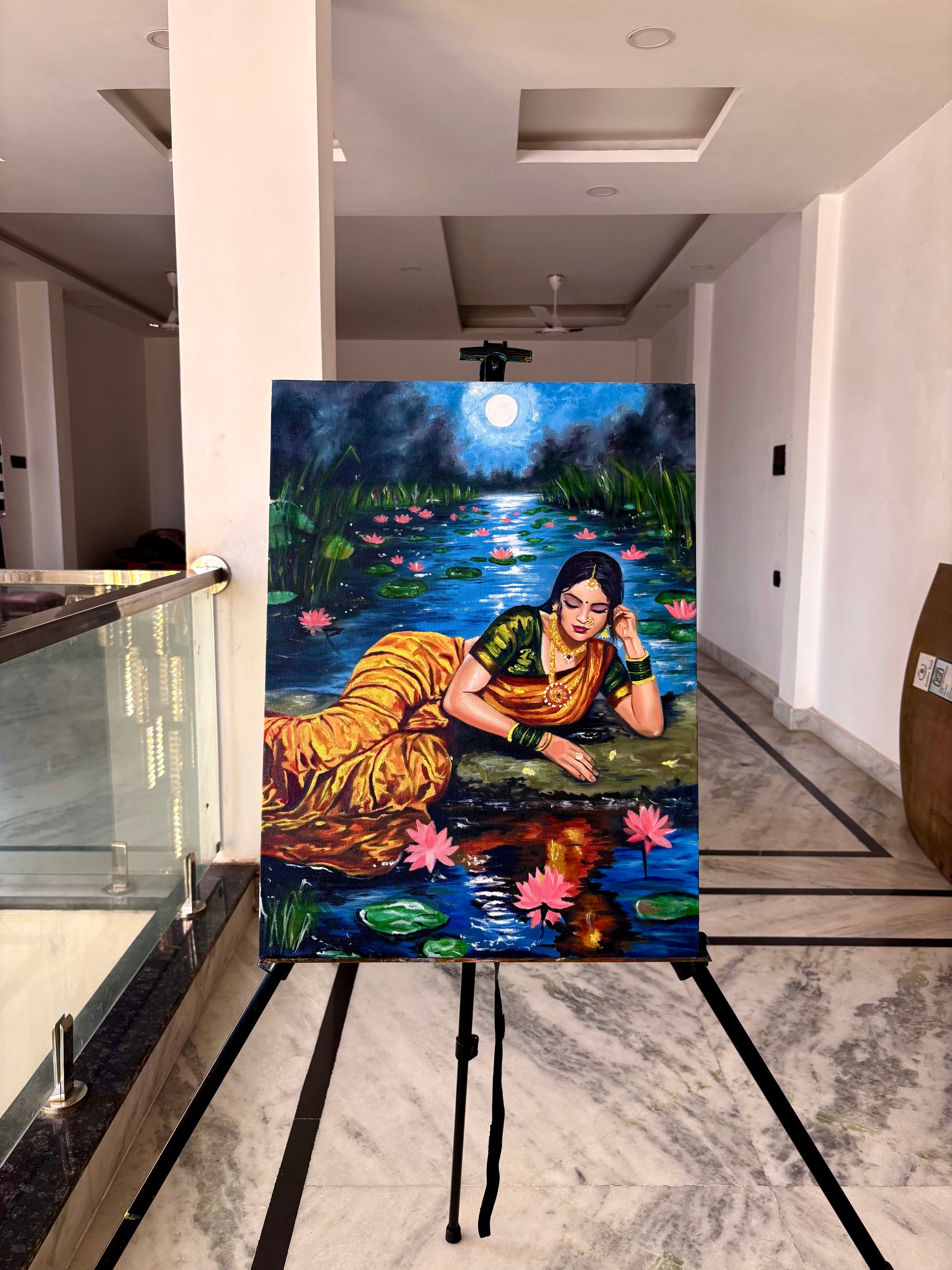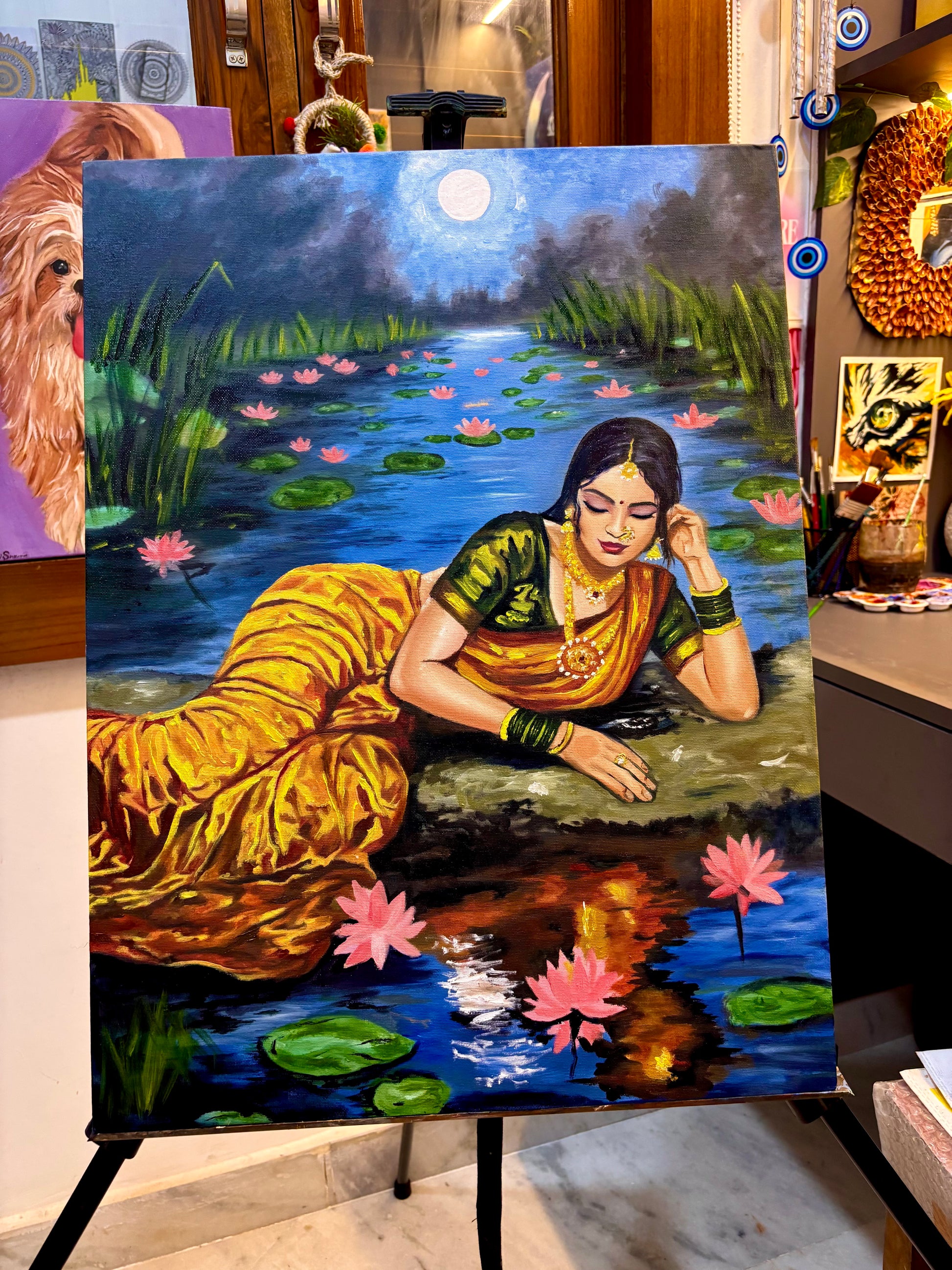 A peaceful scene of a woman resting beside a pond filled with blooming lotus flowers under the moonlight. The calm water and soft reflections create a dreamy atmosphere, capturing a quiet moment of beauty and serenity in nature.